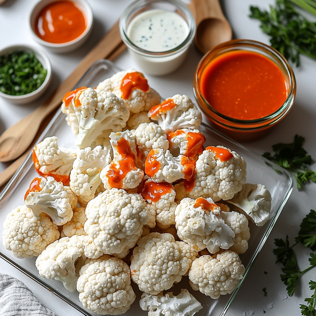 Once your cauliflower bites come out sizzling and crisp, transfer them to a clean bowl and pour the Buffalo sauce over the top. Toss quickly but gently to coat every floret with the vibrant, spicy sauce that makes this recipe shine. Serve these delectable wings piping hot alongside your favorite vegan ranch or blue cheese dressing and a sprinkle of fresh herbs for color and freshness. You’re now ready to indulge in crunchy, tangy, plant-based bliss!