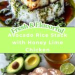 This Avocado Rice Stack recipe features tender, juicy grilled chicken breasts marinated in a zesty honey-lime mix, served atop fluffy jasmine rice and topped with a fresh, chunky avocado, red onion, and cilantro salad. Perfectly balanced with bright citrus flavors and a hint of cumin, this dish offers a delightful combination of textures and tastes ideal for a satisfying and wholesome meal.
