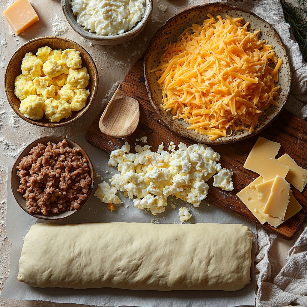Gathering the right ingredients is one of the best parts of making this Breakfast Sausage and Egg Stromboli Recipe. Each item is simple but crucial—the balance of eggs, sausage, and cheese is what gives the stromboli its irresistible flavor and satisfying texture.