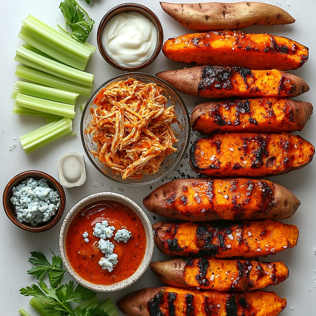The magic of this Buffalo Chicken Stuffed Sweet Potatoes Recipe lies in its simplicity. Each ingredient plays a crucial role: the sweet potatoes provide a warm and earthy base, while shredded chicken soaked in buffalo sauce gives you that signature spicy kick. Creamy Greek yogurt and blue cheese or ranch dressing bring balance and richness, and a few fresh veggies add a welcomed crunch and brightness.