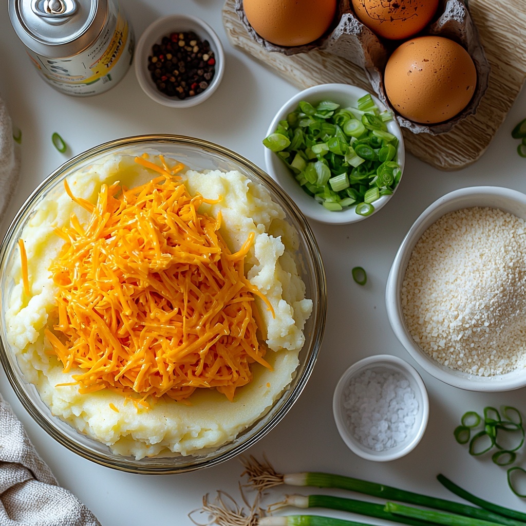 Gathering ingredients for this Cheesy Mashed Potato Puffs Recipe is a breeze because everything is straightforward yet essential to get that perfect balance of creamy, cheesy, and flavorful texture. Each component plays an important role, from the sharp cheddar that melts beautifully to the green onions that add a fresh bite and a pop of color.