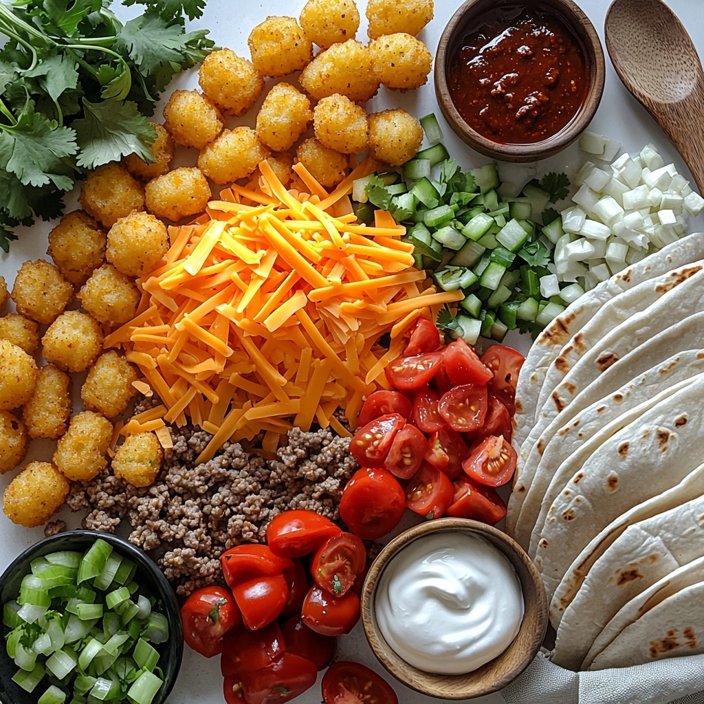 The magic of this Cheesy Potato Burritos Comfort Meal Recipe lies in its simple but essential ingredients, each carefully chosen to create the perfect texture, flavor, and color combo. From crispy tater tots adding crunch to the melty cheese mix, every component plays its delicious part.