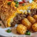 This Cheesy Potato Burritos recipe is a comforting and delicious meal perfect for a quick family dinner. Featuring a savory blend of seasoned ground beef, crispy tater tots, and melted cheddar and Monterey Jack cheeses wrapped in warm flour tortillas, then baked with extra cheese on top for a gooey finish. Topped with creamy sour cream and smoky chipotle sauce, these burritos are sure to satisfy your cravings for hearty, cheesy goodness with a slight spicy kick.