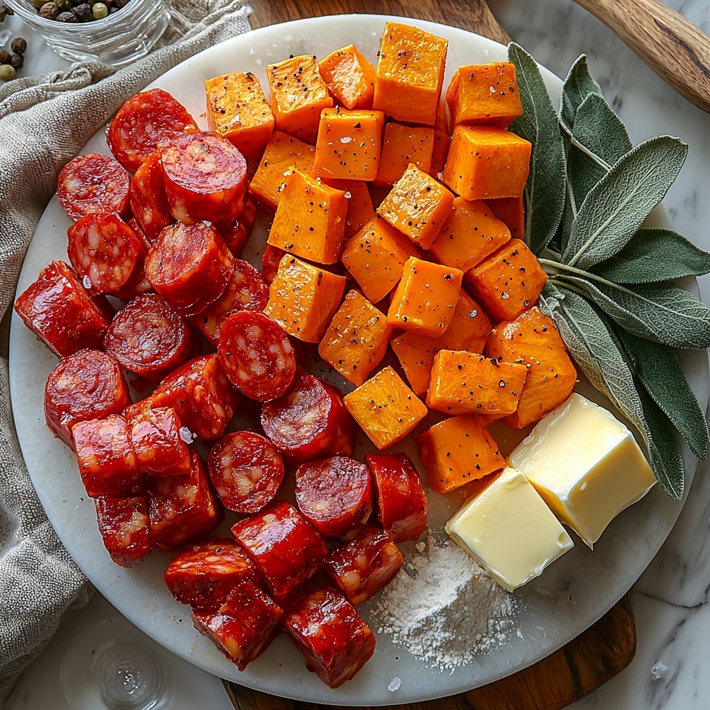 - Combine filling: In a mixing bowl, fold together the roasted pumpkin, cooked chorizo, caramelised onions, and shredded sage. Season with salt and pepper to taste.
