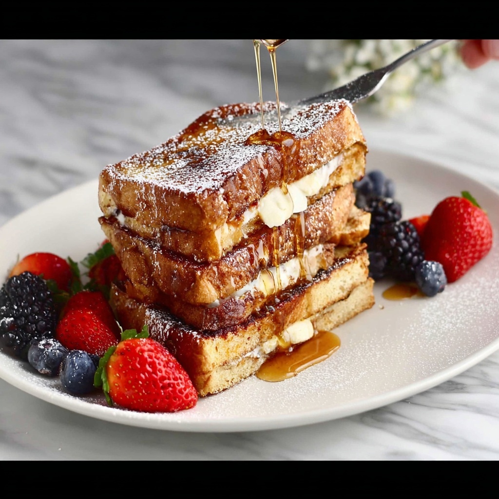 Enhance your Churro Stuffed French Toast Recipe with a variety of garnishes that add texture, freshness, and bursts of flavor. A drizzle of pure maple syrup complements the cinnamon sugar coating beautifully, delivering just the right touch of sweetness. Whipped cream adds airy richness, while fresh berries bring vibrant color and a refreshing tartness that cuts through the richness of the dish perfectly.