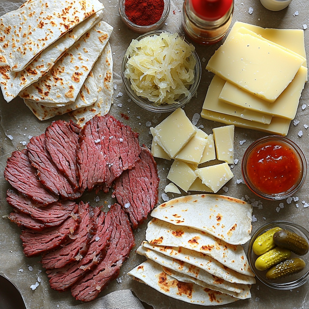 - Assemble the quesadillas: Lay out 6 flour tortillas evenly. On each tortilla, place a slice of Swiss cheese, an even layer of sliced corned beef, a spoonful of drained sauerkraut, and then top with another slice of Swiss cheese. Finish by placing the remaining 6 tortillas on top, pressing gently to hold the layers together.