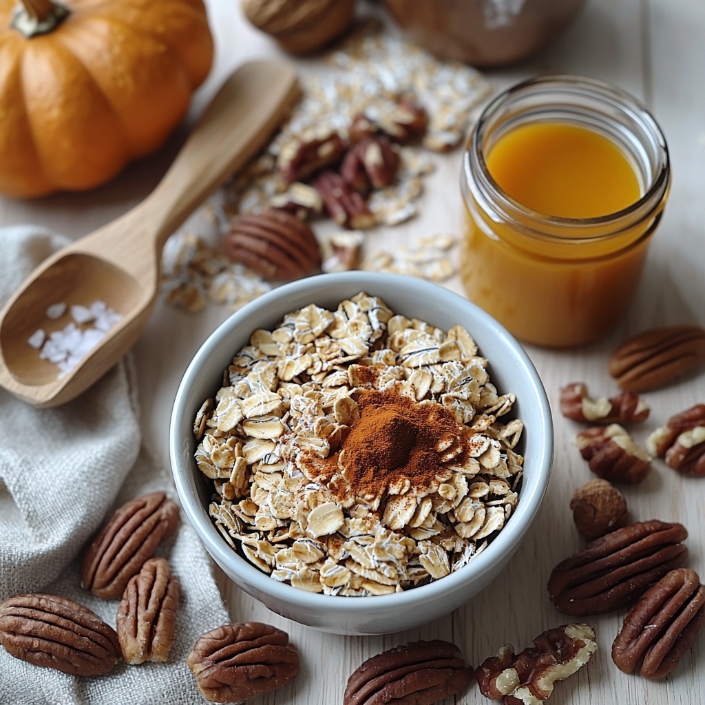 - Combine Dry Ingredients: In a large bowl, mix together the rolled oats, your choice of nuts, pumpkin pie spice, and salt. Stir gently to evenly distribute all dry ingredients.