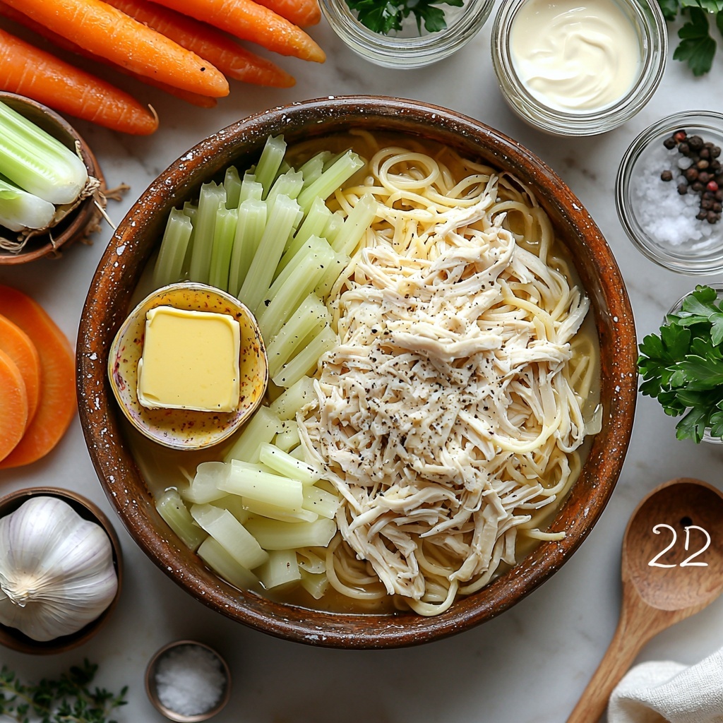 - Add Chicken & Noodles: Stir in the shredded cooked chicken, dried thyme, dried parsley, and egg noodles. Reduce the heat to a simmer and cook for 8–10 minutes or until the noodles are tender and the flavors meld together.