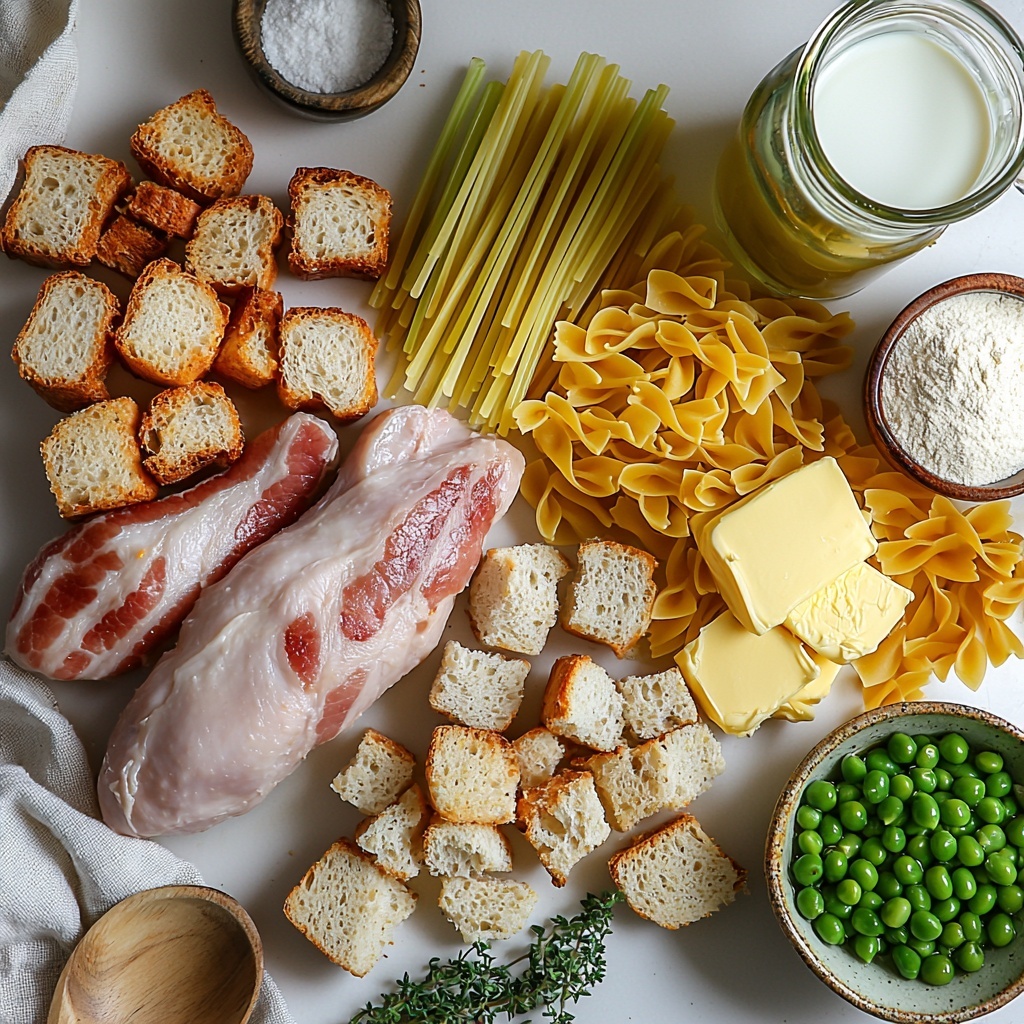 This creamy chicken noodle soup with mini croutons delivers a comforting bowl of warmth and rich flavors, combining tender chicken, crispy bacon, and crunchy homemade croutons. A perfect hearty meal for chilly days made with simple ingredients and cooked on the stovetop to ensure a velvety broth with perfectly cooked pasta and vegetables.