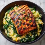 This Creamy Lemony Orzo with Seared Salmon is a delightful and elegant dish combining tender, garlic-toasted orzo pasta cooked in low-sodium chicken broth and enriched with heavy cream, lemon zest, and Parmesan cheese. Finished with fresh spinach stirred in for a boost of color and nutrients, it’s perfectly paired with beautifully seared salmon fillets for a satisfying and flavorful meal that’s ready in just 30 minutes.