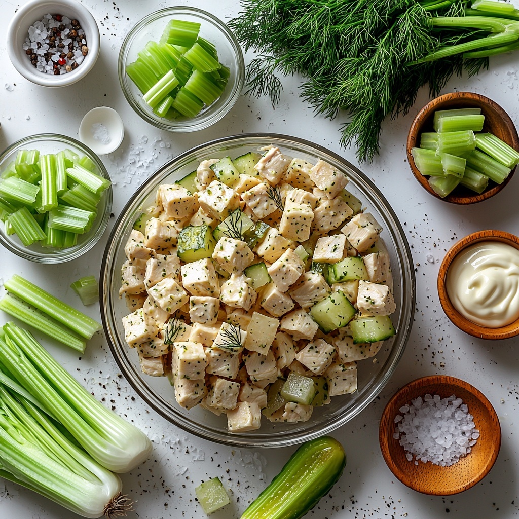 - Combine Ingredients: In a large bowl, add the chopped cooked chicken, finely diced celery, sweet onion, diced dill pickles, and fresh or dried dill. Mix lightly to evenly distribute the ingredients.