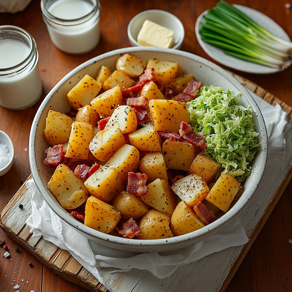 - Combine Ingredients: Fold in the cooked cabbage and most of the bacon into the mashed potatoes, reserving some bacon for garnish.