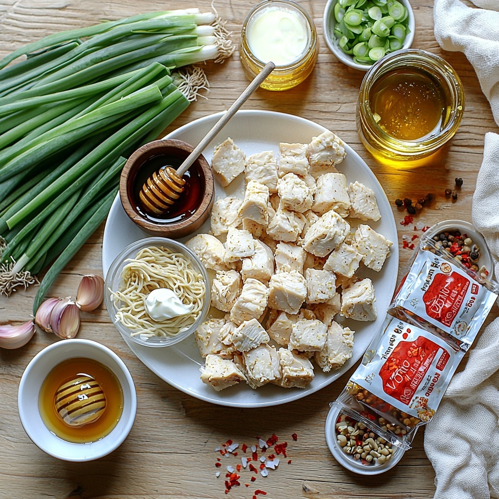 This Fiery Chicken Ramen with Creamy Garlic Sauce Recipe relies on straightforward ingredients that work beautifully together to create layers of flavor, texture, and color. From the tender chicken pieces soaking up a sweet and spicy marinade to the velvety garlic cream swirling through the noodles, each item is essential to building the perfect bowl.
