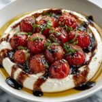 Spoon the warm, bursting cherry tomatoes right into the center of your whipped feta. Don’t forget to include those gorgeous pan juices, as they add an irresistible burst of flavor. Next, generously drizzle a thick balsamic glaze over the top and finish off with a handful of fresh basil leaves or mint for a fragrant, vibrant touch.