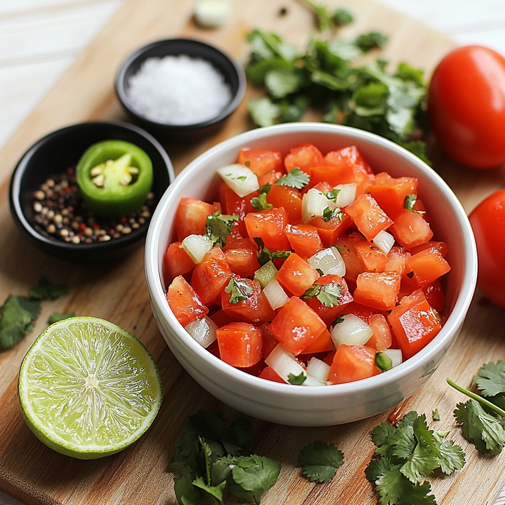 Pico de Gallo is a fresh, vibrant Mexican salsa made with ripe tomatoes, onions, jalapeños, cilantro, lime juice, and seasonings. It’s a simple, no-cook recipe perfect for adding a zesty, flavorful kick to tacos, grilled meats, or as a healthy dip for tortilla chips. The ingredients are finely chopped and marinated together to develop a bright, refreshing taste.
