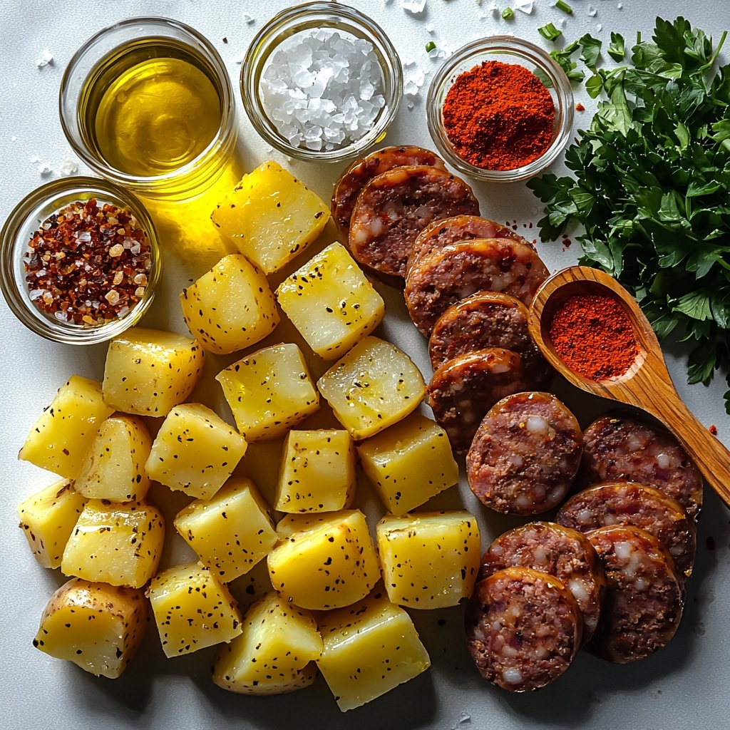 Begin by dicing your Yukon Gold potatoes into evenly sized cubes so they cook uniformly. Slice the smoked Polish sausage into rounds, and thinly slice the yellow onion. This prep makes the cooking process smooth and ensures every bite has the perfect balance of flavors.