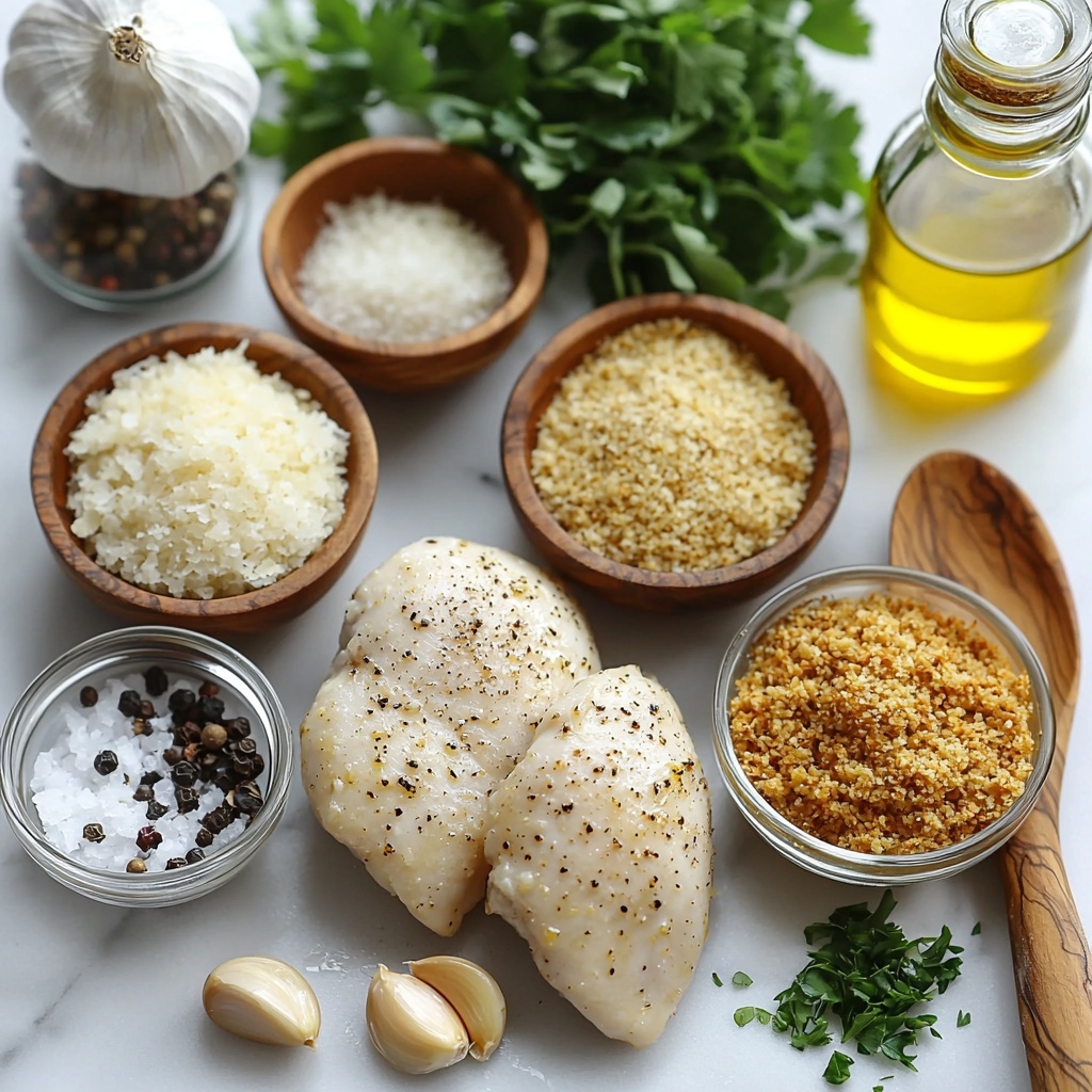 These ingredients are the magic behind the Garlic Parmesan Chicken Recipe: simple staples that come together to create layers of flavor and satisfying textures. Each one plays a key role, from the nutty sharpness of Parmesan to the fresh brightness of parsley and the cozy, toasted breadcrumbs that form the perfect crust.