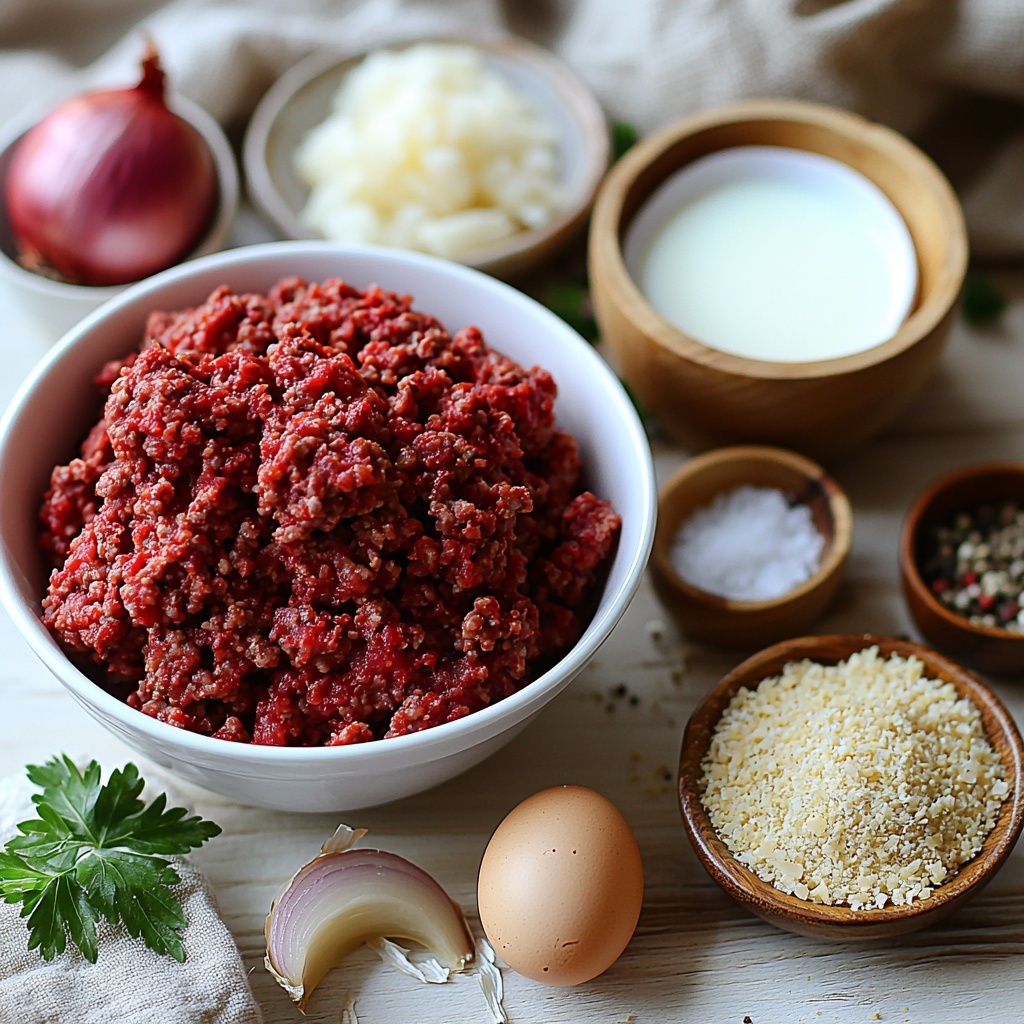 - Combine ingredients: In a large bowl, add the ground beef, breadcrumbs, grated Parmesan cheese, minced garlic, finely chopped onion, egg, milk, salt, pepper, and Italian seasoning.