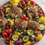 This Greek Sheet Pan Chicken recipe features juicy, bone-in, skin-on chicken thighs marinated in a vivid blend of olive oil, lemon juice, garlic, oregano, thyme, and Dijon mustard, then oven-baked to perfection. It’s a simple and flavorful one-pan meal that combines classic Mediterranean ingredients for an easy weeknight dinner with crispy skin and tender meat.