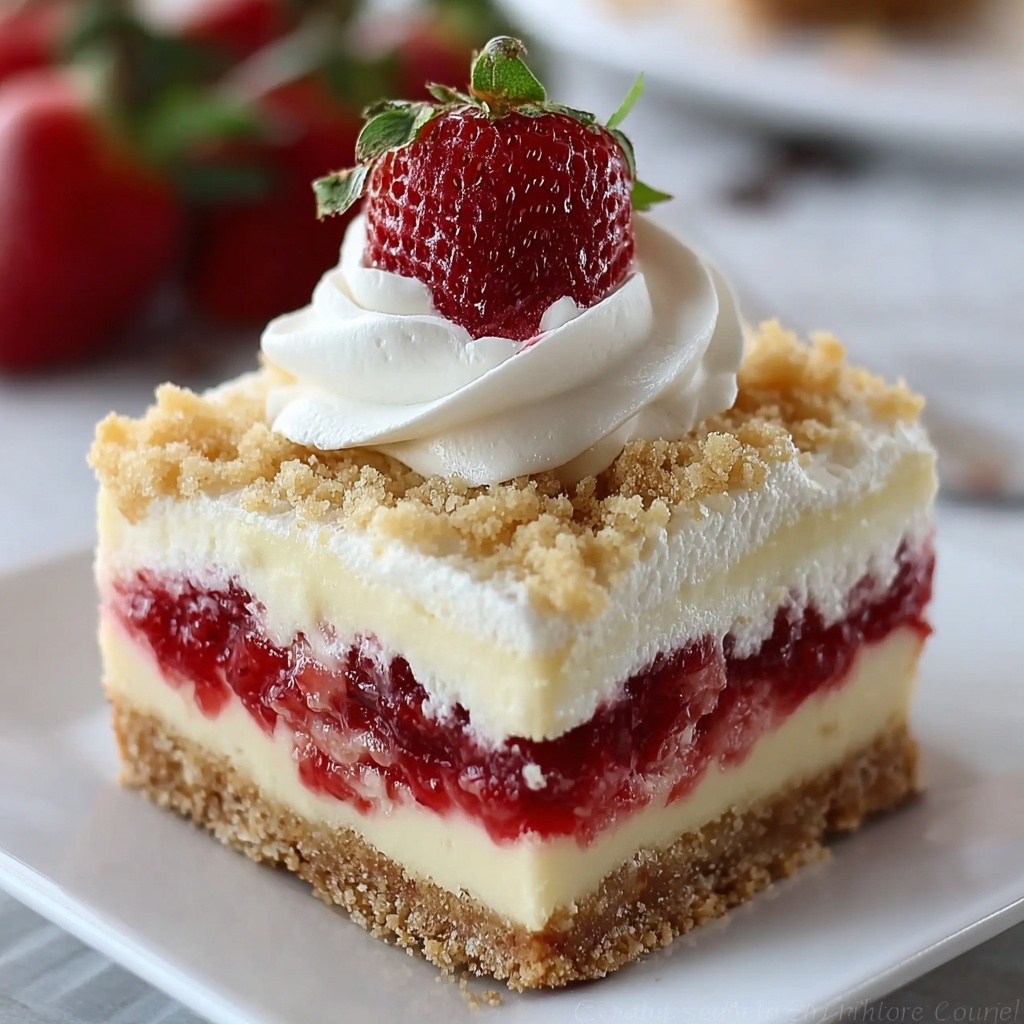 To impress guests, consider serving the bars on a cake stand or decorative platter with a scattering of strawberry slices and fresh mint leaves for color contrast. You can also present individual bars in mini dessert jars layered with whipped cream and extra compote, turning this classic into a charming parfait-style treat.