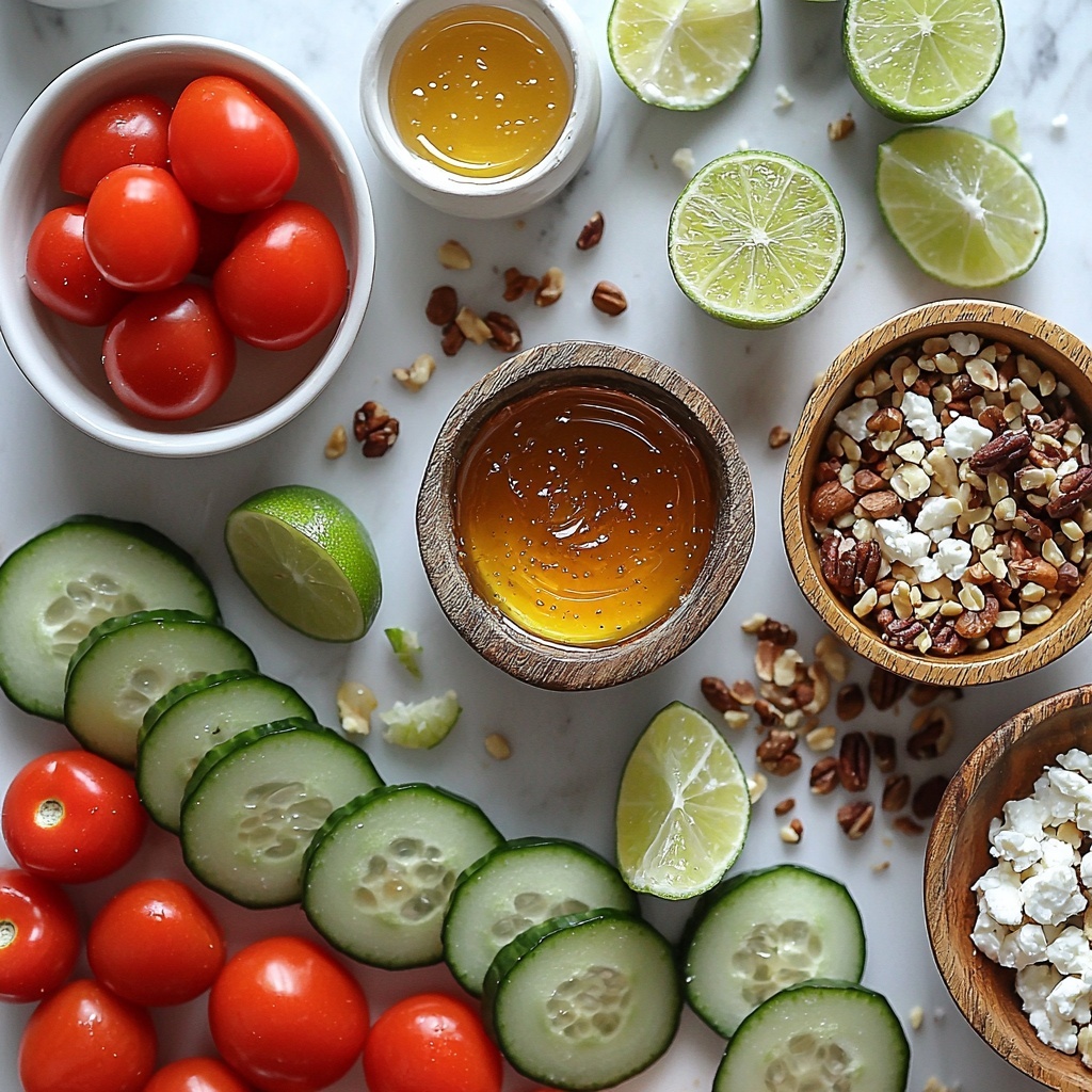 This recipe uses just a handful of ingredients, each playing a crucial role in creating that perfect harmony of taste and texture in your salad. From the juicy cucumbers to the creamy feta and crunchy nuts, every element brings something special to the bowl.