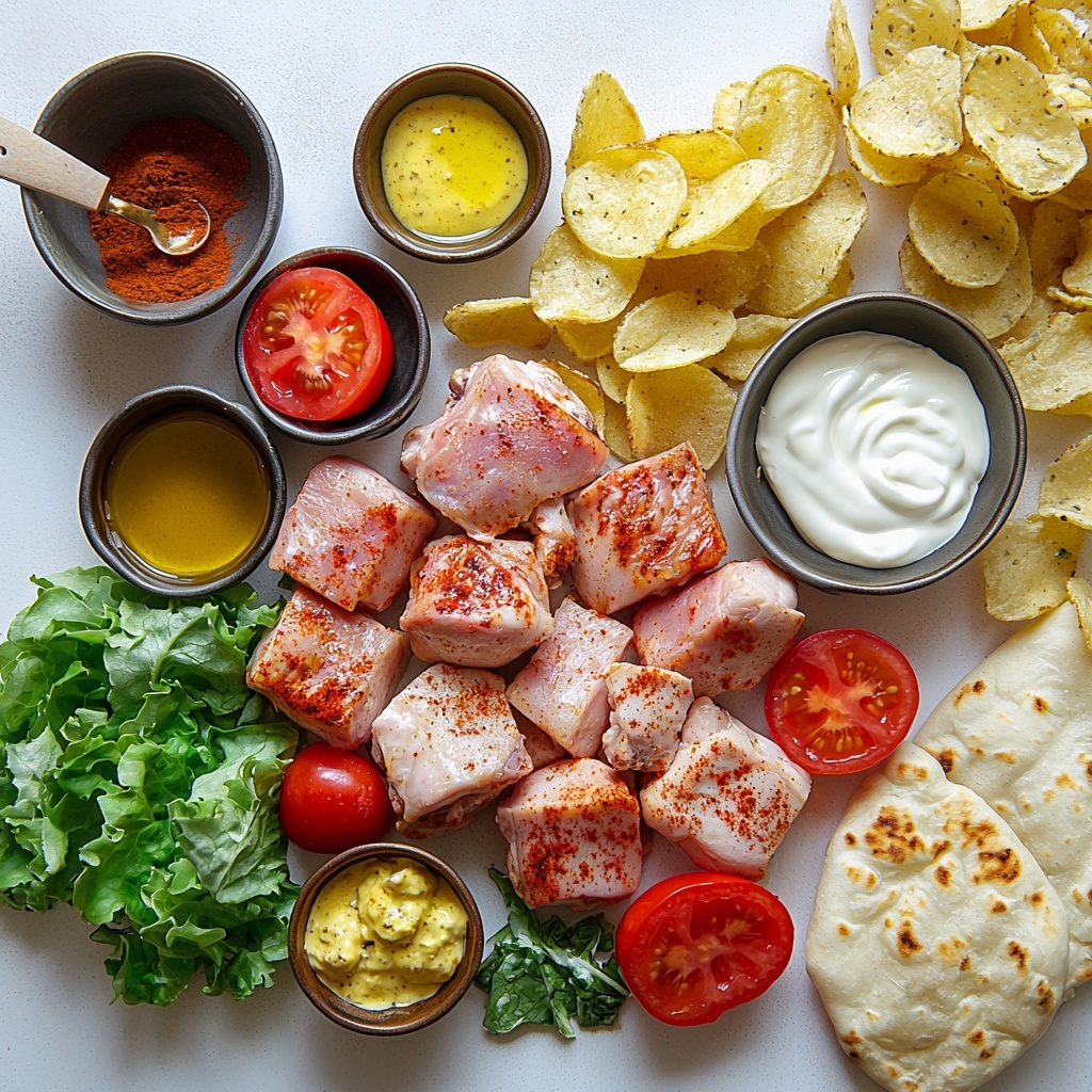While the chicken marinates, whisk together plain yoghurt, whole-egg mayonnaise, olive oil, yellow mustard, garlic powder, sweet paprika, and salt. Setting this sauce aside for a minimum of 20 minutes allows the flavors to meld and develop that iconic tanginess you crave in each bite. Meanwhile, if you’re including chips, cook them according to your preference—baked, fried, or air fried. Don’t forget a quick pinch of salt; this salty crunch is key to the authentic gyro experience.