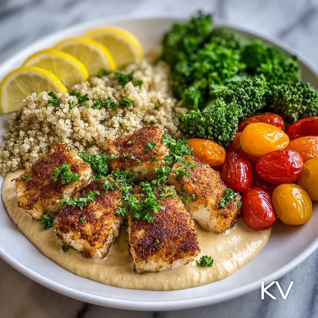 This Lemon Garlic Fish Bowl with Tahini is a healthy and flavorful dinner option featuring tender baked white fish fillets infused with zesty lemon and garlic, served atop a nutritious bed of quinoa, steamed broccoli, and fresh cherry tomatoes, finished with a creamy tahini sauce and fresh parsley garnish.