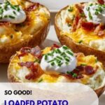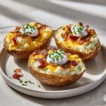 Loaded Baked Potato Skins feature crispy russet potato shells stuffed with sharp cheddar cheese, smoky bacon, and topped with sour cream and fresh chives. This easy-to-make American snack is perfect as an appetizer or family meal, combining rich flavors with a satisfying crunch.