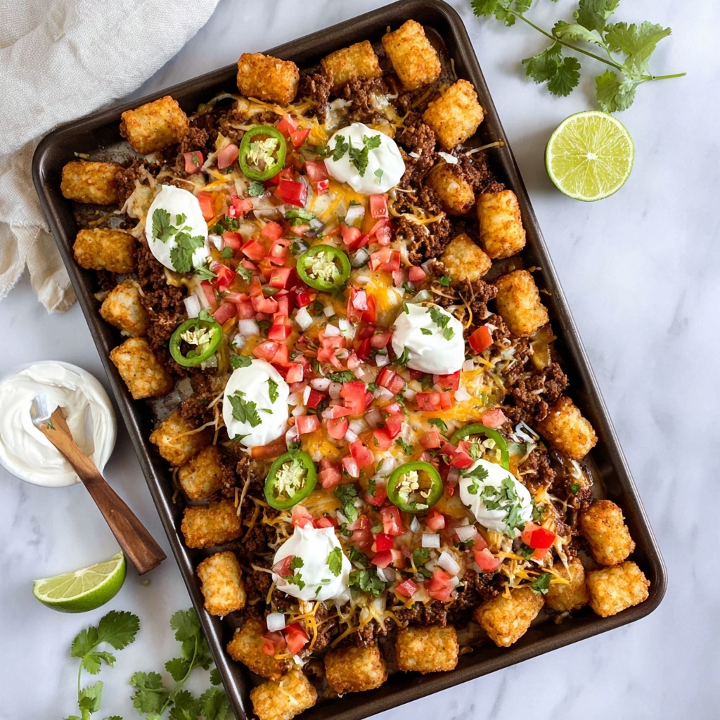 Loaded Tater Tot Nachos are a flavorful and fun twist on traditional nachos, featuring crispy baked tater tots topped with seasoned ground beef, cheesy queso, melted Monterey Jack cheese, and a variety of optional fresh toppings. Perfect for a game day snack or casual family dinner, this recipe combines crunchy textures and savory flavors in an easy-to-make oven-baked dish.