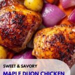 Juicy, bone-in, skin-on chicken thighs roasted to perfection with a sweet and tangy maple Dijon glaze, accompanied by tender baby potatoes, carrots, and red onion. This easy-to-make American dinner balances savory and slightly sweet flavors, perfect for a comforting weeknight meal.