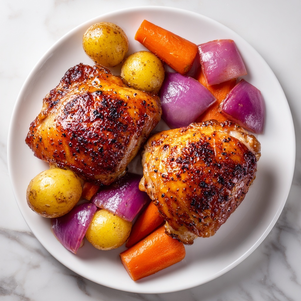 Juicy, bone-in, skin-on chicken thighs roasted to perfection with a sweet and tangy maple Dijon glaze, accompanied by tender baby potatoes, carrots, and red onion. This easy-to-make American dinner balances savory and slightly sweet flavors, perfect for a comforting weeknight meal.