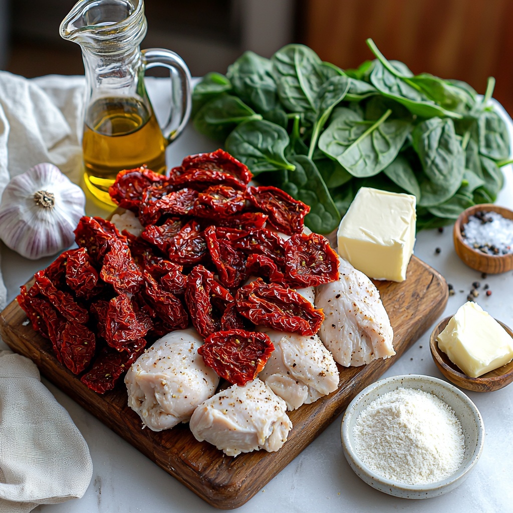 This recipe calls for straightforward ingredients, each playing an essential role in building layers of flavor and texture in the soup. From the juicy chicken and savory broth to the bright spinach and tangy sun-dried tomatoes, every component is chosen to create that perfect creamy and indulgent balance.