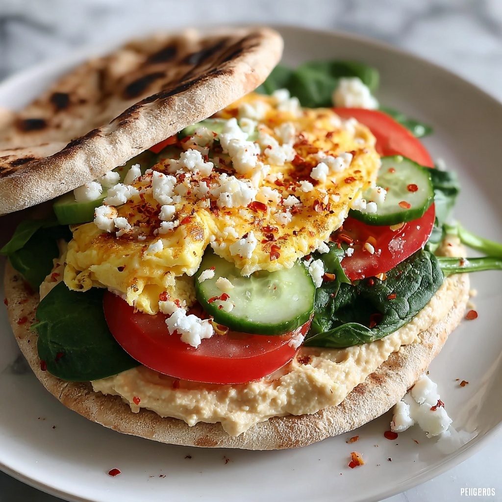 A quick and healthy Mediterranean Breakfast Sandwich featuring fluffy scrambled eggs, fresh vegetables, creamy hummus, and tangy feta cheese wrapped in warm whole wheat pita bread. Perfect for a nutritious start to your day in just 18 minutes.