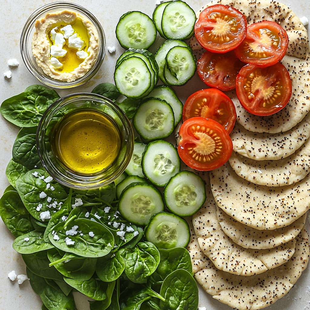 - Assemble sandwich: Spread 1 tablespoon of hummus inside each pita pocket, then layer in fresh spinach leaves, tomato slices, and cucumber slices.