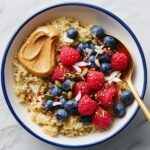- Assemble and serve: Spoon the warm quinoa into serving bowls, then top with the fresh berries, toasted almonds, coconut flakes, roasted pepitas, and a dollop of nut butter of your choice for added richness and flavor.
