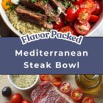 A vibrant and healthy Mediterranean Steak Bowl featuring grilled sirloin or flank steak served over fluffy quinoa mixed with fresh vegetables, olives, and crumbled feta cheese. This flavorful bowl is drizzled with olive oil and lemon juice for a bright, satisfying meal perfect for lunch or dinner.