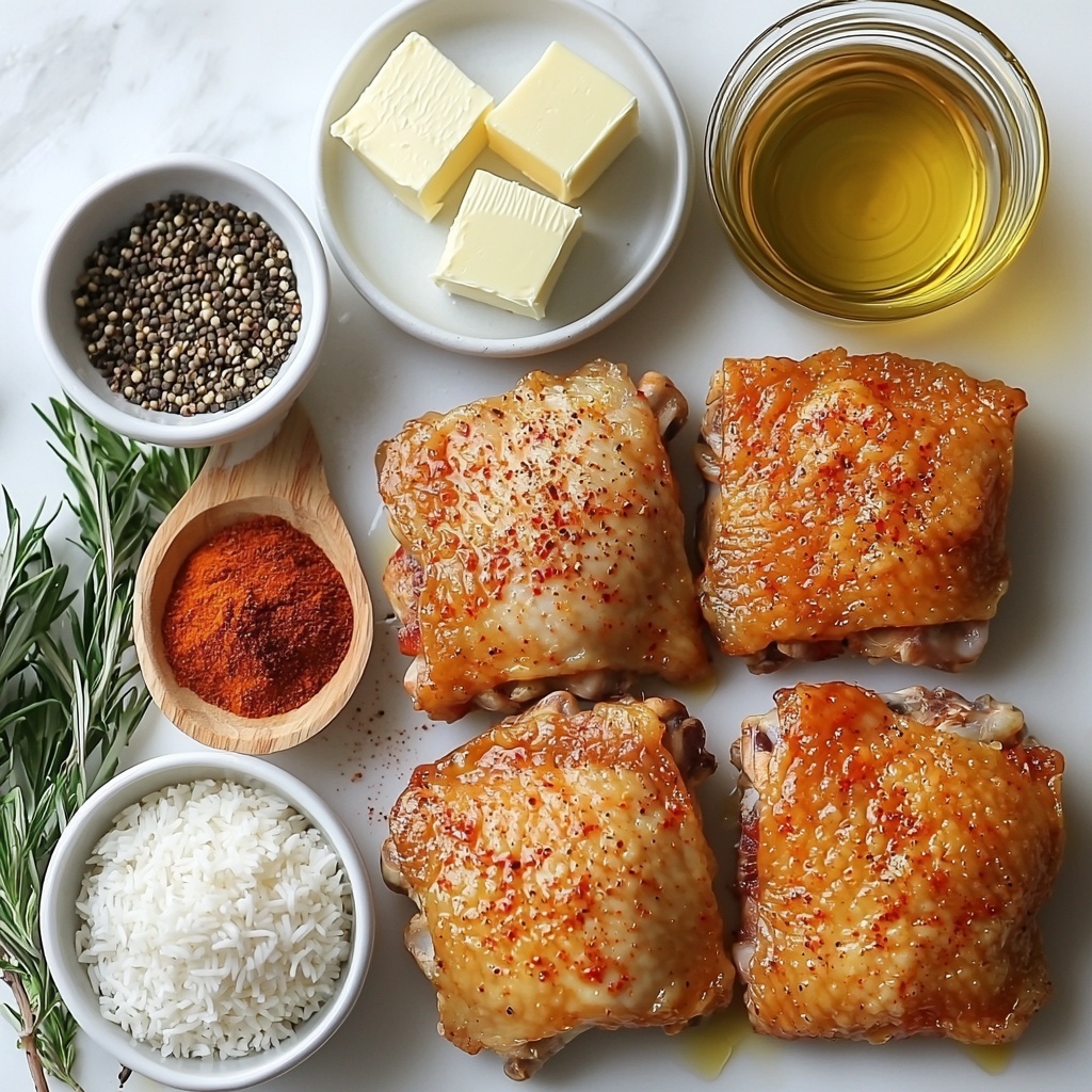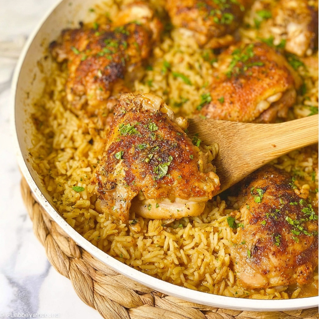 A comforting and flavorful one-skillet recipe featuring crispy bone-in chicken thighs cooked atop buttery, seasoned rice. This easy-to-make meal combines tender chicken with perfectly cooked long grain rice infused with chicken broth and aromatic spices, all prepared in a single pan for minimal cleanup.