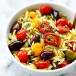 This vibrant Orzo Pasta Salad combines al dente orzo with juicy cherry tomatoes, tangy artichoke hearts, briny Kalamata olives, sweet dried Craisins, and tender cooked chicken. Tossed in a flavorful homemade dressing made of olive oil, tarragon vinegar, lemon juice, and Dijon mustard, this salad is perfect for a quick lunch or a light dinner. Packed with fresh herbs and bold flavors, it’s a delightful Mediterranean-inspired dish that can be served immediately or chilled for later.