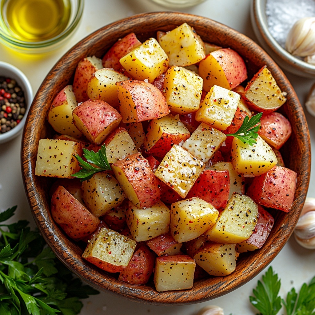 Cut your Yukon Gold potatoes (or your mixture of choice) into bite-size pieces—around 1 to 1 ½ inch chunks work great. Toss them in a bowl with 2 to 3 tablespoons of extra-virgin olive oil to ensure every piece gets coated evenly. In a separate small bowl, whisk together melted butter, garlic powder or minced garlic, salt, and pepper, then drizzle that mixture over the potatoes and toss again so those flavors get locked in.