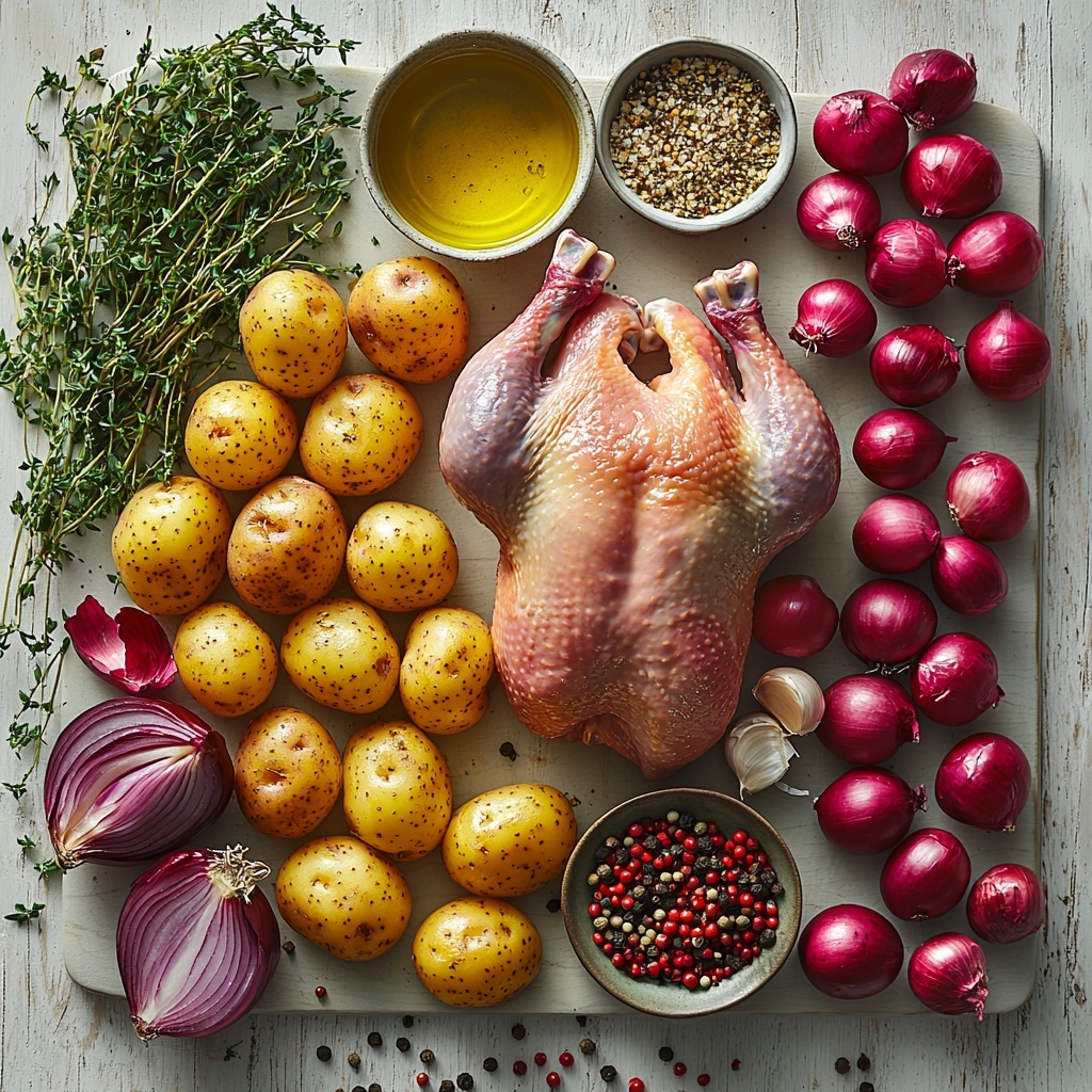 A classic and foolproof recipe for perfectly roasted whole chicken with tender, flavorful baby potatoes, red onions, and garlic. This dish features a crispy, golden-brown skin and juicy meat infused with aromatic spices and fresh thyme, ideal for a comforting family meal.