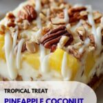 These Pineapple Coconut Pecan Cheesecake Bars offer a tropical twist on classic cheesecake with a crunchy graham cracker and pecan crust, creamy pineapple and coconut filling, and a delightful white chocolate drizzle on top. Perfect for a refreshing dessert that combines rich, creamy textures with sweet and nutty flavors.