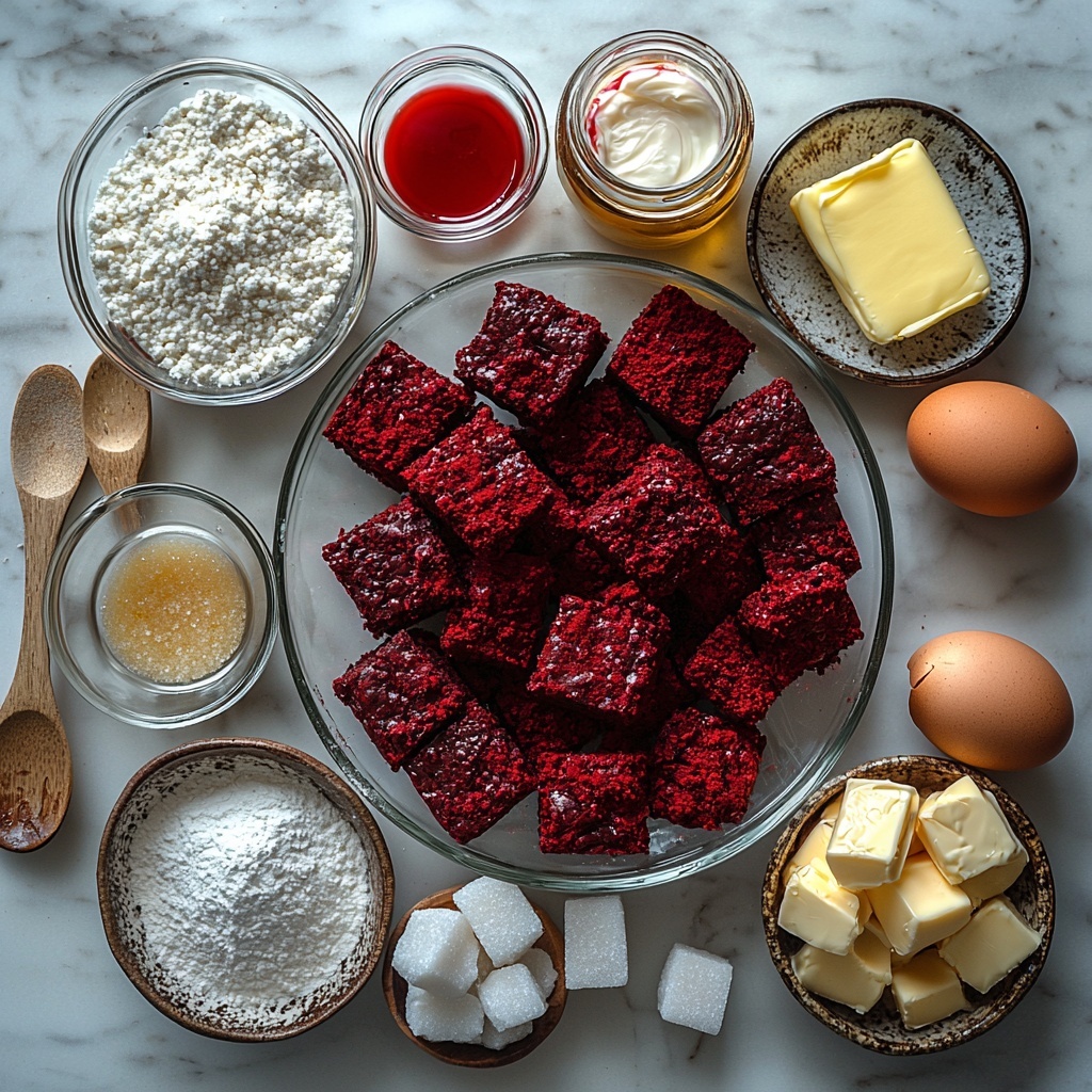 This recipe calls for straightforward, pantry-friendly ingredients that come together to create those iconic red velvet brownies with a luscious frosting. Every component plays a crucial role, from the butter that adds richness to the cocoa and red food coloring that define the brownie’s characteristic color and depth of flavor.