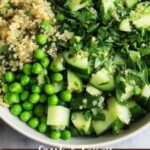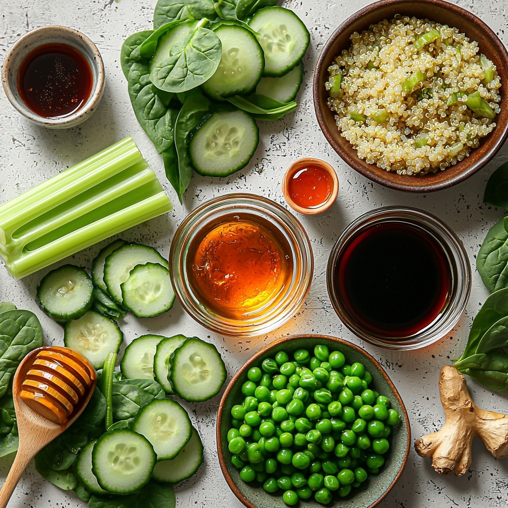Grab a large salad bowl and toss together your chopped cucumber, celery, green peas, baby spinach, and cooked quinoa. Each ingredient brings a different texture—crispness, tenderness, and earthiness—which makes every bite exciting and fresh.