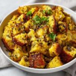 This classic savory bread stuffing recipe is made with day-old bread cubes, sautéed onions and celery, and fresh herbs like sage, thyme, and parsley. Moist and flavorful, it’s baked to golden perfection with a crispy top, making it the perfect side dish for holiday meals or any comforting dinner.