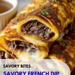 These Savory French Dip Tortilla Rollups are an easy and delicious appetizer featuring thinly sliced roast beef, sautéed onions and bell peppers, Swiss cheese, and horseradish sauce, all rolled inside soft flour tortillas. Toasted to a golden brown and served with warm beef broth dipping sauce, they offer a flavorful twist on the classic French dip sandwich in a convenient bite-sized form.