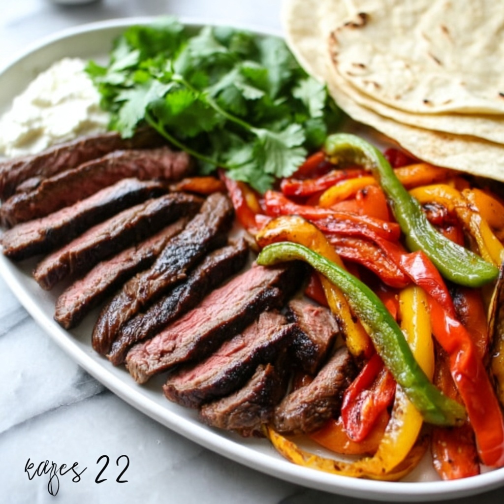 Sizzling Steak Fajitas bring bold, smoky flavors to your table with tender, marinated flank steak grilled to perfection alongside caramelized bell peppers and onions. This classic Tex-Mex favorite is served with warm tortillas and fresh toppings like cilantro, avocado, and creamy yogurt or sour cream for a deliciously satisfying meal perfect for gatherings or weeknight dinners.
