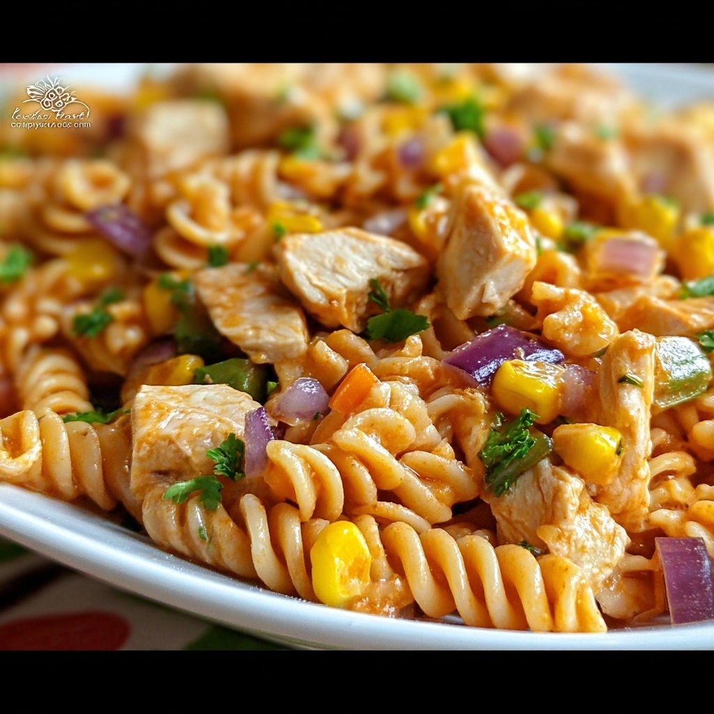 - Combine Salad Ingredients: In a large mixing bowl, combine the cooled pasta, shredded chicken, corn kernels, halved cherry tomatoes, diced red onion, diced red bell pepper, shredded cheddar cheese, and chopped fresh cilantro.