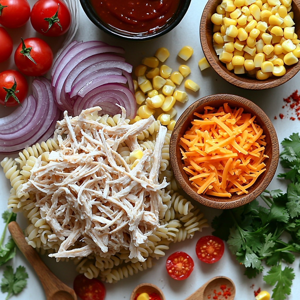 Grab a large mixing bowl and toss in the cooled rotini, shredded chicken breast, corn kernels, halved cherry tomatoes, diced red onion, red bell pepper, shredded cheddar cheese, and chopped cilantro. This colorful medley sets the stage for the smoky magic to come, ensuring every bite bursts with a mix of textures and flavors.