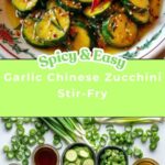 A vibrant, spicy garlic Chinese zucchini stir-fry featuring tender zucchini slices tossed in a flavorful chili-soy sauce, enhanced with fresh garlic, ginger, and garnished with green onions and sesame seeds. Quick and easy to prepare, this stir-fry makes a perfect light side dish or a healthy vegetarian option.