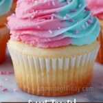 In a medium bowl, cream the softened unsalted butter with the vanilla extract and an additional 1 to 1 1/2 teaspoons of cotton candy flavoring. Gradually beat in the confectioners’ sugar, alternating with your choice of heavy cream or milk to keep it fluffy and easy to pipe. Divide the frosting into two bowls, tinting one blue and the other pink to match your cupcakes for the perfect pastel finish.